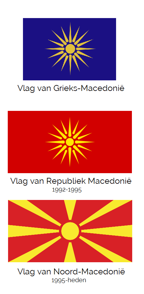Een grote speldenprik was de nieuwe vlag van de Republiek Macedonië. Zij kozen ervoor om de Zon van Vergina hier af te beelden. Deze Zon was het symbool van Alexander de Grote en werd ook gevonden op de kist met botten van Philippus II, die in Vergina ontdekt werd. De Zon van Vergina geniet de status van nationalistisch symbool in de Griekse regio Macedonië en is van groot belang voor de Griekse identiteit aldaar. In Vergina en Thessaloniki zul je deze vlaggen ook heel uitgebreid tegenkomen. Rechts zie je de vlag van Grieks-Macedonië, met daaronder de vlag van de Republiek Macedonië. In 1995 besloot de Republiek Macedonië, onder grote internationale druk, de vlag aan te passen. Het nieuwe ontwerp was geïnspireerd op de Zon van Vergina, maar bleek acceptabel voor de Grieken.